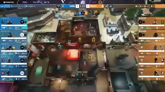 04:27:15Ein Timeout von Marshmallows and Molotovs (M&M) wird genommen. Es folgt eine Diskussion über Lieblingsorganisationen im E-Sport, wobei Team Liquid genannt wird. Valentino erzielt einen überraschenden Spawnpeak gegen Justus. Falcons wollen in Runde 6 mit einem 4:2 in Führung gehen, während M&M Gaming einen 3:3-Ausgleich anstrebt. Es wird erneut Gym und Bedroom gespielt. Valentino erzielt einen frühen Kill mit der MPX. Tyrant gleicht mit einem späten Refrag aus. M&M Gaming nähert sich dem Approach aus der ersten Attacke auf Master & Bathroom an. Es gibt keinen Frag durch eine geworfene Granate, aber Nate sorgt für eine Überzahlsituation. Solotov hat den Diffuser dabei. Tyrant hat eine gute Position, wird aber angeschossen. Solotov erzielt Kills, aber die Zeit läuft ab. Falcons gewinnen die Runde und führen mit 4:2.
