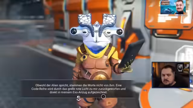 03:50:01Bei der Erkundung einer Raumstation stößt der Streamer auf ein Terminal, das trotz seltsamer, pulsierender Substanz funktioniert. Nach der Interaktion öffnet sich das Gerät und gibt einen Bauplan für Antimaterie frei, begleitet von einer mysteriösen Nachricht. Gleichzeitig wird ein universeller Übersetzungsdienst aktiviert, der das Lernen einer neuen Alien-Sprache ermöglicht, beginnend mit dem Wort 'du'.