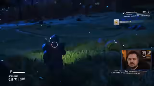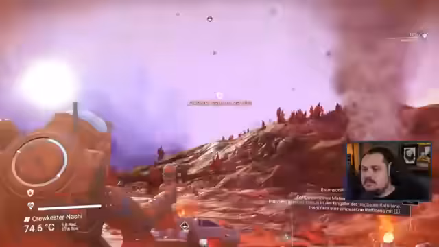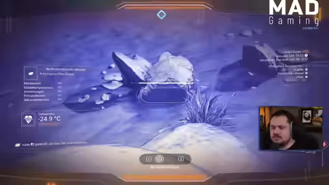 00:40:19Der Streamer startet ein neues Spiel in No Man's Sky und landet auf einem sehr unwirtlichen, unfruchtbaren Planeten mit hoher Temperatur (72 Grad) und gefährlichen Bedingungen. Das Tutorial wird durchlaufen, um die grundlegenden Überlebensmechanismen zu verstehen, einschließlich der Reparatur des beschädigten Exo-Anzugs und der Suche nach Ressourcen wie Natrium und Feritstaub. Die Anfangsphase erweist sich als äußerst herausfordernd.
