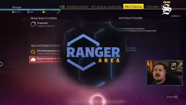 00:54:01Der Streamer folgt der Anleitung des Schiffssystems und sucht nach dem hermetischen Siegel, das für die Reparatur des Impulsantriebs unerlässlich ist. Er entdeckt die Position auf seiner Planetenkarte und macht sich auf den Weg dorthin, wobei er verschiedene Gefahren wie Feuersbrünste und aggressive Tierarten wie die Nasen-Ocelots umgehen muss. Die Suche gestaltet sich schwierig, aber er findet schließlich das benötigte Siegel in einem verlassenen Archiv.