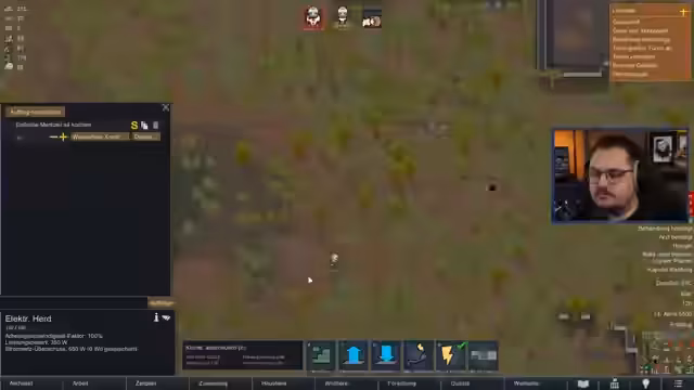 02:54:28Der Stream beginnt mit Diskussionen über Geschmacksrichtungen, insbesondere den Zusammenhang von Marzipan und Dr. Pepper. Ein humorvoller Glaubenskrise-Themenkomplex wird eingeleitet, der die anfängliche Verwirrung im neuen RimWorld-DLC widerspiegelt. Es finden sich erste technische Erkenntnisse über den elektrischen Herd und seine Funktionsweise heraus, während die Kolonie mit den grundlegenden Herausforderungen des Überlebens konfrontiert ist.