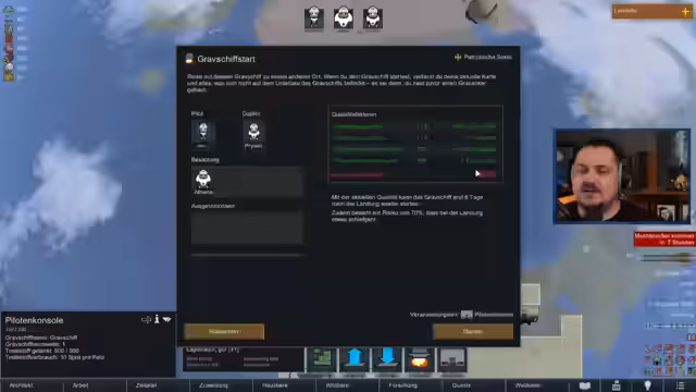 01:09:13Die Vorbereitungen für den Abflug sind abgeschlossen. Das Team gibt den Befehl, das Grafschiff zu starten. Der Streamer muss dabei wichtige Abwägungen treffen, da der gewählte Landeplanet außerhalb der maximalen Reichweite des Schiffes liegt. Die Entscheidung wird getroffen, auf einem nahegelegenen Gelände zu landen, um Treibstoff zu sparen. Der Start des Schiffes markiert den Beginn der eigentlichen Odyssee, bei der die Kolonie ihre neue mobile Heimat in einer feindlichen Umgebung aufbauen und verteidigen muss.