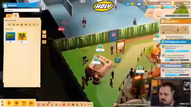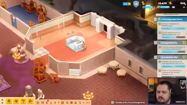 01:04:46Der Stream konzentriert sich wieder auf das Hauptspiel 'Two Point Hospital'. Das Ziel für den heutigen Sonntag ist es, das Museum weiter auszubauen, insbesondere ein Grusel-Hotel-Exponat zu kreieren. Hierfür benötigt der Streamer einen Geisterschlüssel, der durch den Abschluss einer Expedition gewonnen werden kann. Um die nötigen Ressourcen zu farmen, beginnt er mit dem wiederholten Öffnen von Forschungskisten. Er überlegt auch, die Anordnung des Eingangsbereichs umzudrehen, um einen besseren Besucherfluss zu schaffen, und bittet die Chat um Meinung dazu. Der Fokus liegt darauf, durch das Farmen von Erfahrungspunkten die Qualität der Exponate zu verbessern.