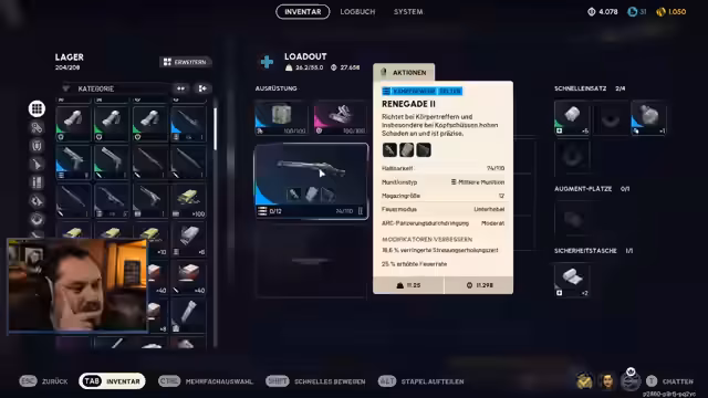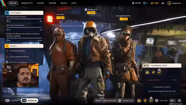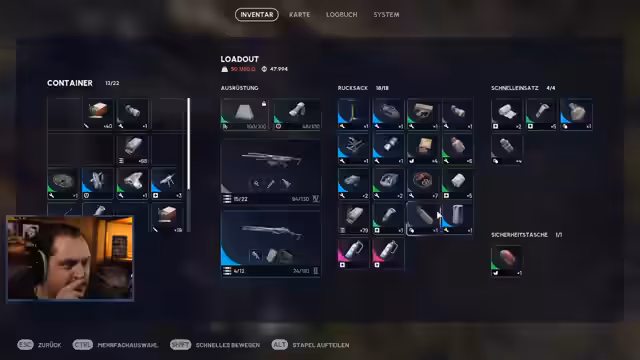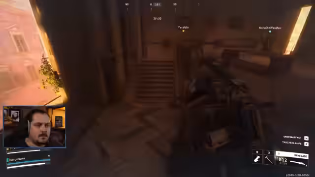 04:11:42Die Spieler bereiten sich auf die nächste Runde vor, wobei die Ausrüstung und das Inventar überprüft werden. Ein Spieler hat eine Sicherheitstasche und nur Munition dabei, während ein anderer Spieler eine Waffe mitbringt. Die Map 'Raumhafen' wird als wenig gespielt und daher noch unbekannt beschrieben. Bei der Erkundung eines Gebäudes werden sie von Gegnern überrascht, darunter ein Spion und ein Aufklärer. Sie brechen eine Tür auf, um Kabel zu finden, die für eine Quest benötigt werden. Ein Spieler findet eine weitere Waffenkiste und eine Bettina-Blaupause. Die Gruppe entdeckt weitere Waffenkisten-Spots und gerät in einen Kampf, bei dem Granaten eingesetzt werden. Ein Spieler wird ausgeschaltet und muss wiederbelebt werden.