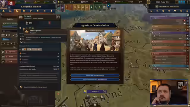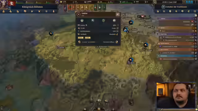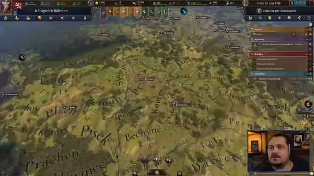 01:13:39Der Spieler verfügt über 52.000 Soldaten, was 10.000 mehr ist als Frankreich oder England, und wird ermutigt, sich als Kastilien keine Sorgen zu machen. Ein zeitkritisches Event, das sich auf die böhmische, ungarische und polnische Allianz gegen die österreichische Expansion bezieht, wird ausgelöst. Der Spieler entscheidet sich für den historischen Weg, um Polen nicht zum Rivalen zu machen. Es wird erklärt, dass das Spiel im Jahr 1337 beginnt und die Epoche der Kriege zwischen Frankreich und England in Westeuropa thematisiert. Das Spiel endet voraussichtlich um 1840, wenn Victoria 3 beginnt, wobei danach keine neuen Ereignisse mehr generiert werden. Der Begriff 'Plakitum Regium' wird als 'Königliche Vereinbarung' übersetzt. Es wird erwähnt, dass Brandenburg ein schwieriges Land zum Spielen ist, während Böhmen als übermächtig gilt.