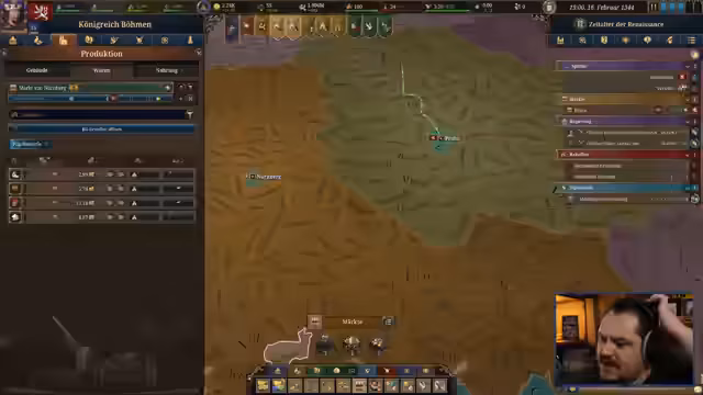 00:59:25Das Spiel Europa Universalis 5 wird als enorm komplex beschrieben, selbst für erfahrene Spieler. Es erschlägt mit einer Fülle an Details und Tabellen, was nicht jedem gefällt; einige bevorzugen Spiele wie Anno oder Arc Raiders. Ein Zuschauer fragt nach der Effektivität der Münzprägung, die bei 50% liegt. Dies wird auf zu wenig Kronenmacht oder fehlende Waren zurückgeführt. Es wird geraten, Produkte zu produzieren, die auf dem Markt knapp sind, um mehr Profit zu erzielen. Eine vereinfachte Methode, um Gebäude zu bauen, die einen positiven Effekt haben, wird erklärt: Man klickt auf die Fahne 'Pops mit Bedarfen', wo rote Zahlen Mangel anzeigen und blaue Flächen mit grünen Zahlen profitable Bauprojekte vorschlagen. So wird beispielsweise der Bau einer Schmuckproduktion empfohlen, da diese den größten Profit verspricht.