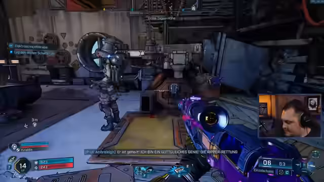 01:53:04Eine Zwischensequenz mit Katzen wird gezeigt. Eine Mission führt zu einer Schnellreisestation, die fertiggestellt werden soll. Es wird über die schlechte Framerate und Shooting-Skills diskutiert. Ein Charakter hat einen spanischen Akzent. Der Streamer erinnert an den Geburtstag der Mutter und die Schwierigkeit, Verpflichtungen und Streaming zu vereinbaren. Eine Nebenmission in 3.700 Metern Entfernung wird in Angriff genommen. Der Nahkampf wird thematisiert und ein Roboter im Klo gefunden. Der Streamer äußert den Wunsch, Synchronsprecher für Borderlands zu sein. Es wird erwähnt, dass der Streamer Theater Schauspieler war und ein Stipendium abgelehnt hat. Ein Ruckwildhorn und ein Inferno-Kalbshorn werden erwähnt. Der Streamer springt runter zum Ziel und läuft hinterher. Es wird über die abgehobene Art von Schauspielern und Übersetzungsfehler diskutiert. Eine Mission wird abgeschlossen und der technische Zustand des Spiels auf PC als Hölle bezeichnet, obwohl es beim Streamer erstaunlich gut läuft. Nvidia hat ein Update veröffentlicht, um die Performance zu verbessern. Es gibt Probleme mit Timeouts im Chat. Der Streamer snackt etwas und plant, als Nächstes das Ordenssilo zum Freischalten der Schnellreise einzunehmen.