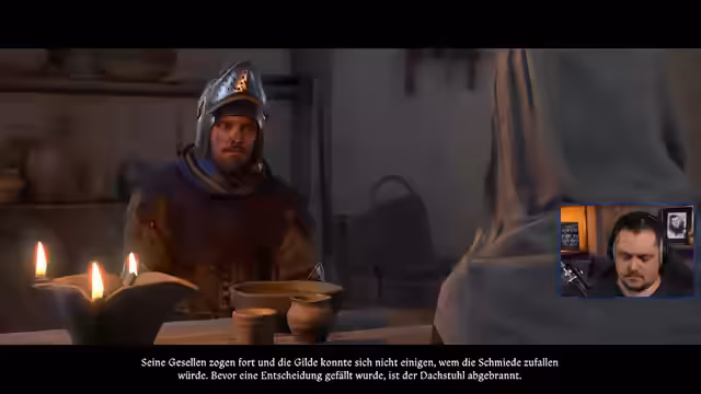 06:04:39In der Schmiede interagiert der Streamer mit einem NPC, der ihm von der Vergangenheit und dem Vater erzählt. Die Dialoge und die Wahlmöglichkeiten in der Interaktion werden gezeigt. Die emotionale Anbindung des Streamers zum Spiel wird deutlich, als er über seine positive Erfahrung mit Kingdom Come Deliverance 2 spricht. Es werden erste Handels- und Reparaturaktionen in der Schmiede durchgeführt.