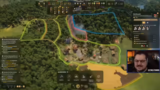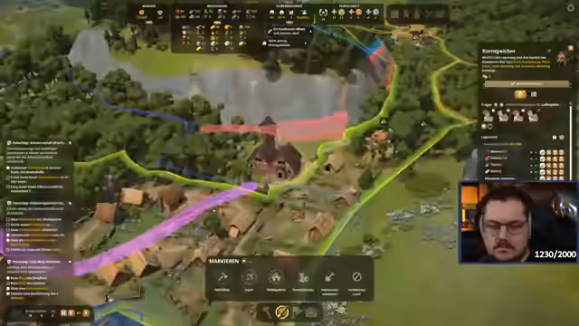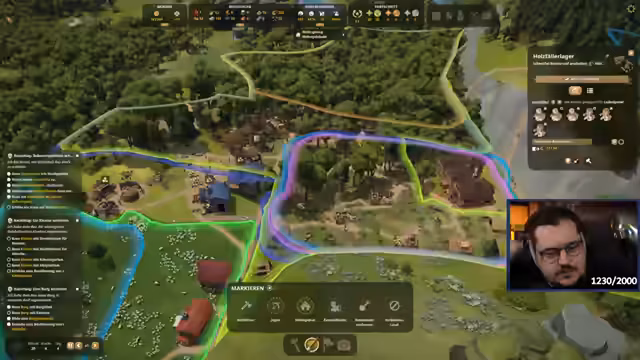 01:28:56Der Streamer geht im Detail auf das Farbleitsystem im Spiel ein und erklärt die Bedeutung der verschiedenen Farben: Rot für verbotenes Land, Dunkelblau für Aufforstung, Gelb für Landwirtschaft, Grün für Wohnhäuser und andere Farben für Aktivitäten wie Jagen und Patrouillen. Er betont, dass die Weideflächen automatisch vergrößert werden, wenn sie festgelegt sind.