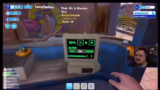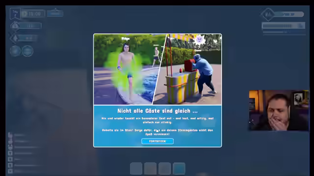 03:40:24Es wird erklärt, dass Rutschen die Hauptattraktion des Wasserparks sind und dass es wichtig ist, den Gästen die richtigen Rutschenpässe zu verkaufen. Der Streamer versucht vergeblich, ein unerwünschtes Objekt im Park zu entfernen. Es wird festgestellt, dass selbst die aktivsten Gäste Toiletten und Liegestühle benötigen. Der Streamer baut ein Plumpsklo und Liegestühle, wobei er sich über den rostigen Zustand der Liegen lustig macht. Es wird ein Virus vermutet, da sich der Streamer unwohl fühlt. Zuschauer kommentieren die akrobatischen Sprünge eines Gastes ins Becken. Der Streamer baut ein Scheißhaus neben dem Becken und schließt Wetten ab, ob jemand im Park sterben wird. Ein Gast wartet ungeduldig auf sein Ticket, und der Streamer scherzt über das Alter der Gäste. Es wird festgestellt, dass Gäste im Spiel sterben können. Es wird Werbung für den Park gemacht, und der Streamer interagiert mit den Gästen, indem er Tickets verkauft und sie unterhält.