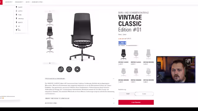 00:25:50Der Streamer zeigt einen Bürostuhl für große Menschen und betont die Notwendigkeit eines bequemen Stuhls für lange Streaming-Sessions. Er diskutiert die Bedeutung von Ergonomie und Lordosenstütze und erwähnt, dass er bereits Erfahrungen mit solchen Stühlen hat. Es werden verschiedene Aspekte des Stuhls wie Kopfstütze, Schamlehne und ungebremste Sicherheitsdoppelroller angesprochen. Der Streamer vergleicht den Kauf eines guten Stuhls mit der Investition in ein gutes Bett und betont, dass er bisher wenig Wert auf Komfort gelegt hat. Er erwähnt Interstuhl als eine Marke, die ihm empfohlen wurde, und äußert sich amüsiert über die ungewöhnliche Gestaltung der Webseite. Es wird über RGB-Beleuchtung für Stühle und die Bedeutung einer abgedunkelten Webseite diskutiert. Der Streamer erwähnt Backforce als eine weitere Marke, die er in Betracht zieht. Er sucht nach einem normalen Stuhl auf der Interstuhl-Webseite und findet verschiedene Modelle, darunter den Vintage-Stuhl für 3200 Euro, was zu Überlegungen über mögliche Raid Shadow Legends-Sponsorings führt.