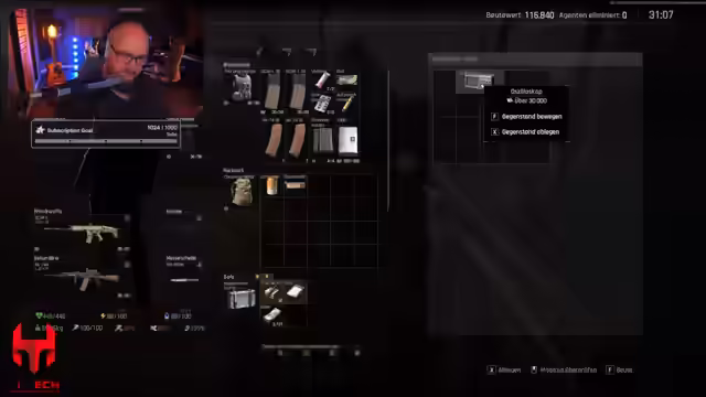 03:12:58Der Spieler muss nach einer Runde das Inventar verwalten und überlegt, was verkauft werden soll. Es wird festgestellt, dass die Gebühren beim Verkaufen auf dem Markt weh tun. Der Spieler nimmt zwei Gegenstände mit und geht runter. Es wird überlegt, ob man die Gegenstände für das Ausbauen der Basis braucht. Der Spieler findet Akustikpaneele und kommentiert, dass diese wichtig sind. Es wird festgestellt, dass Solo-Runden verschwitzter sind. Der Spieler hat keine Lust mehr und muss trotzdem das Inventar verwalten. Es wird kommentiert, dass es ein riesiger Unterschied ist, wie viel man für Gegenstände bekommt. Der Spieler verkauft verschiedene Gegenstände und überlegt, was für eine neue Runde drinbleiben soll. Es wird neue Munition gekauft und die vorhandene Munition wird organisiert. Der Spieler nimmt verschiedene Gegenstände mit und freut sich über eine Granate. Es wird eine Sperrzone mit keinem Ausrüstungsverlust gewählt. Der Spieler startet eine neue Runde auf der Karte TV-Sender, da diese Spaß macht. Es wird ein warmer Energy getrunken und ein Rasierer gefunden. Der Spieler lootet nur noch blau, außer Shampoo.