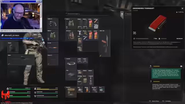 02:54:36Der Stream beginnt in der Spielnacht, wobei die geringe Sichtbarkeit mit Nachtsichtgeräten als problematisch beschrieben wird. Nach einem kurzen PvP-Kampf gegen einen Spieler namens Falcon und der Einnahme eines Außenpostens, stößt der Streamer auf technische Performance-Probleme mit starken FPS-Einbrüchen, was zu einem Neustart des Spiels führt. Trotzdem wird der Spaß am Gameplay betont, insbesondere die Loot-Phase wird als sehr gelungen angesehen, da man viel an nützlichen Gegenständen wie Blutbeutel, Schmerztabletten und Panzerwesten findet.