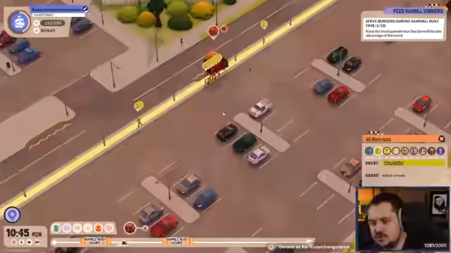01:17:30Nachdem das Equipment installiert ist, wird der Truck in der Stadt positioniert, um Kunden zu bedienen. Die erste Kundengruppe besteht aus Arbeitern aus einer nahegelegenen Sägemühle. Ein Vertrag mit ihnen wird angenommen, was die Reputation des Unternehmens verbessern kann. Gleichzeitig stellt der Streamer seine Geschäftsidee als einen simplen 3-Schritte-Plan vor: Truck eröffnen, unklare Schritte einfügen und Profit machen. Die Einnahmen von 6,86 Dollar für ein bloßes Brötchen mit Frikadelle werden als fragwürdig bewertet.