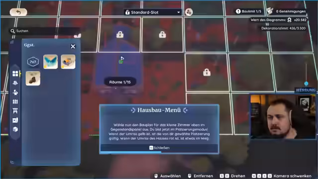 05:45:01Der Fokus verschiebt sich stark auf den Bauteil des Spiels. Der Streamer beginnt, sein Grundstück aktiv zu gestalten, indem er ein Lagerfeuer und andere Strukturen errichtet. Er probiert den umbaubaren Hausmodus aus und erkundet diverse Biome, in denen man Grundstücke erwerben kann. Dabei wird er von diversen, teilweise seltsamen Quests abgelenkt, wie der, fünf Geschenke an Dorfbewohner zu verteilen, was er als lästig empfindet, aber dennoch umsetzt, um seine Beziehungen im Dorf zu verbessern.