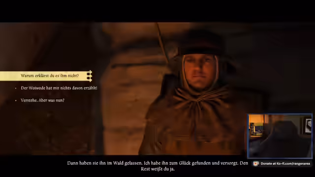 02:26:12Der Streamer ändert seine Meinung und hilft der Frau, den Leichnam ihres Bruders auszugraben und umzubetten. Nachdem er dies getan hat, werden er von Rittern der Kreuzherren angesprochen. Diese erzählen ihm von einem Betrüger namens Konrad, der einen ihrer Brüder angeschossen hat und flüchtig ist. Die Ritter bitten den Streamer um Hilfe, um Konrad aufzuhalten und das Heu in dessen Hütte in Brand zu setzen.
