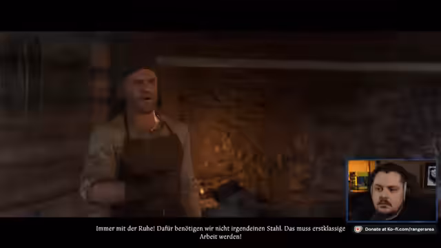 01:14:43Beim Schmied angekommen, erhält der Streamer einen wichtigen Auftrag. Radovan benötigt ein Schwert aus erstklassigem Stahl für eine Hochzeit. Der aktuelle Bestand an geschweißtem Stahl ist jedoch unzureichend für ein solch wertvolles Schwert, das nicht zerbrechen soll. Radovan schlägt vor, den Einsiedler Ambrosius in Apollonias aufzusuchen, der eine angeblich hochwertige Toledo-Klinge besitzt.