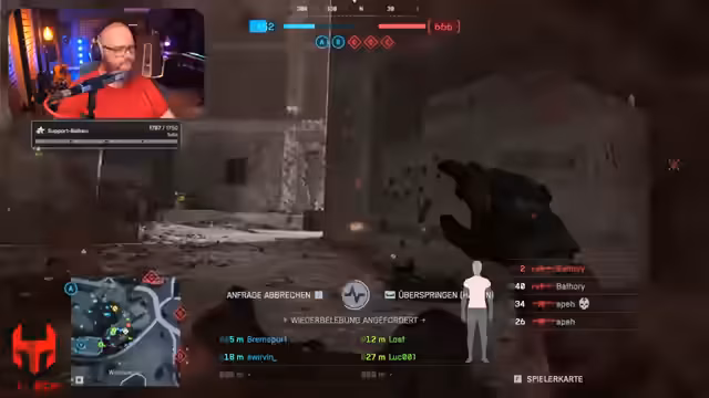 02:02:27Zu Beginn des Streams konzentriert sich der Streamer auf das Versorgen von Teammitgliedern und das Erledigen der Wochenaufgabe. Er erwähnt den Besitz eines 30-minütigen XP-Boosts und wünscht sich eine Multiplayer-Kampagne, die er als sehr spannend empfindet. Die bisherige Story des Spiels hält er für eher durchschnittlich, wobei er Bad Company 2 als Ausnahme mit einer starken Story hervorhebt. Er ist begeistert, dass er selbst im Spiel als NPC verewigt ist.