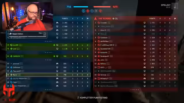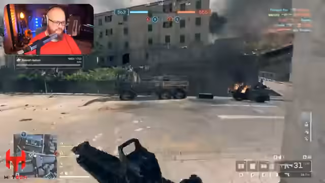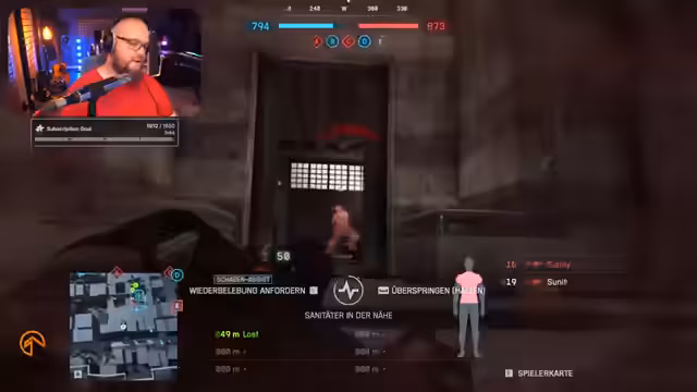 08:55:06Das Gameplay ist von hektischen Kämpfen geprägt, besonders im Umgang mit Helikoptern und als Infanterist. Der Streamer landet einen kritischen Heli-Hit, kann den Gegner jedoch nicht sofort final eliminieren. Beim Versuch eines Revivs wird er selbst ausgeschaltet. Später taucht ein feindlicher Jet auf, der aber zunächst ablenkt. Die Kämpfe finden in beengten urbanen Umgebungen statt, was zu zahlreichen, knappen Todesmomenten und Reviv-Situationen führt.