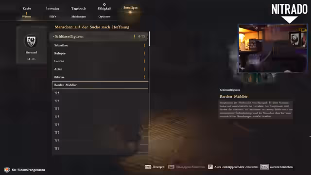 05:52:23Eine tiefere Erkundung der Spielwelt offenbart vielfältige wirtschaftliche und soziale Systeme. Der Streamer entdeckt einen Viehhändler, der sich auf den Handel mit Tieren spezialisiert hat, und stellt fest, dass der Spieler selbst in den Tierhandel einsteigen kann. Des Weiteren wird die Existenz eines Angel-Systems erwähnt. Die Erkundung führt auch zur Entdeckung von Tarnumhängen, verschiedenen Waffen wie Doppelschwertern und die Funktion von Erinnerungsfragmenten, die die Geschichte der Welt weitererzählen.