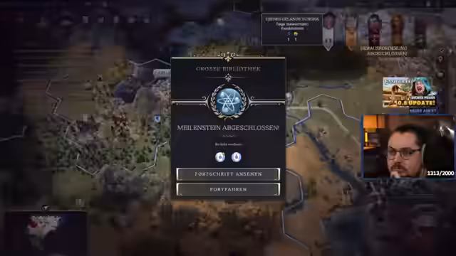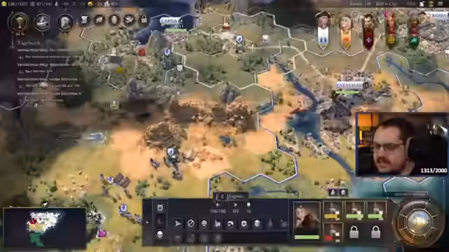 05:47:05Der Streamer positioniert sich selbst als den 'besten Civ-7-Spieler im deutschsprachigen Raum' und verbindet dies mit seinem aktiven Gameplay. Parallel dazu findet eine erfolgreiche Spionageaktion statt, bei der eine Technologie gestohlen und somit ein technologischer Vorteil erzielt wird. Trotz des Erfolgs ist die angespannte globale Lage mit der drohenden Revolte in einer Stadt weiterhin ein Hauptfokus.