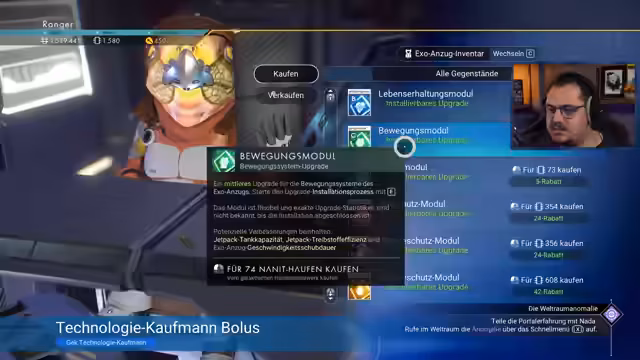 03:42:31Der Streamer erreicht eine Raumstation und interagiert mit verschiedenen Charakteren. Nach dem Abklicken diverser Inventargegenstände wird ein Graumarkt-Operator entdeckt, der jedoch nur unter speziellen Bedingungen Waren verkauft. Ein verlorener Reisender wird angetroffen, dessen Haut durchsichtig erscheint. Dieser gibt an, aus einer unbekannten Region des Weltraums zu stammen und warnt davor, zum Zentrum zu gehen und nicht zuzuhören. Er bietet Informationen gegen Units an. Der Reisende zeigt ein abstraktes, blutrotes Objekt, das den Streamer mit Hoffnung erfüllt. Es folgt der Besuch eines Technologie-Kaufmanns, der Exo-Anzug-Upgrades im Tausch gegen Naniten anbietet. Ein Verkäufer-Gag namens Doik wird getroffen. Später wird ein Ficken-Verbündeter gegrüßt und versucht, deren Sprache zu lernen.