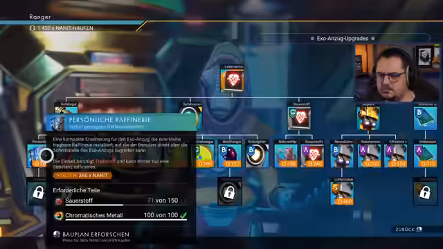 01:00:04Der Streamer konzentriert sich darauf, der Primärmission zu folgen und gleichzeitig einige Sekundärmissionen zu erledigen. Er besitzt bereits Fracht und muss zum Aufseher zurückkehren sowie ein verlassenes Gebäude nach Daten durchsuchen. Ein weiteres Ziel ist die Installation von Apollos eigenem Kraftfeld im Multi-Werkzeug, wofür ein Ionen-Akku und ein Kabelbaum benötigt werden. Der Ionen-Akku erfordert Kobalt und Ferit-Staub, während der Kabelbaum gekauft werden kann. Nach dem Upgrade des Multiwerkzeugs soll der Streamer Naniten sammeln, um Technologie-Upgrades zu erwerben, wobei verlassene Gebäude eine gute Quelle darstellen. Der Streamer folgt der Hauptstory, um den roten Faden nicht zu verlieren und die Übersicht zu behalten, da das Spiel sonst überwältigend sein kann. Er plant, sich später um die Basis zu kümmern und konzentriert sich zunächst auf Missionen, insbesondere im All mit der Unsinkbar 2, wobei die Frage aufkommt, was mit der Unsinkbar 1 geschah.