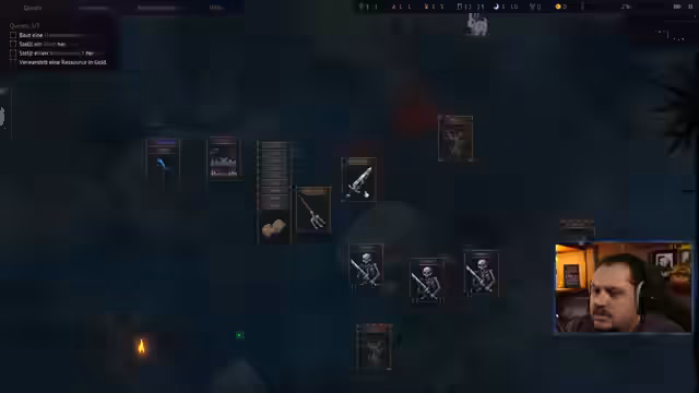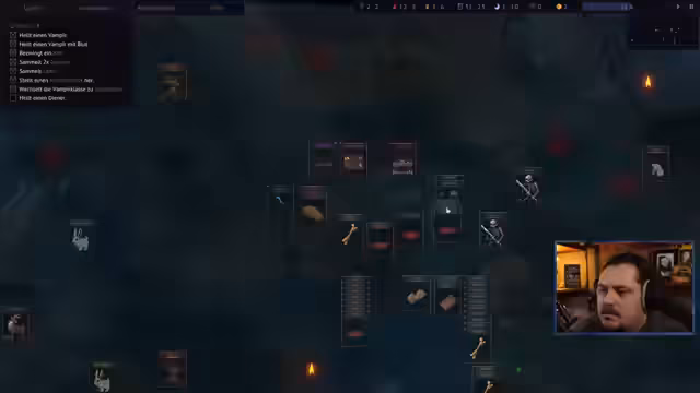 02:47:12Nach einem kurzen Wechsel präsentiert der Streamer das Indie-Spiel 'Decks of the Damned', ein Deck-Builder mit Taktik- und Ressourcenmanagement. Nach einer kurzen Abwesenheit zum Einstellen der Sprache beginnt er mit dem Tutorial, um die Grundlagen des Craftings, der Kämpfe und des Aufbaus einer Vampirhorde zu erklären. Die erste Aufgabe besteht darin, Ressourcen wie Holz und Blut durch das Platzieren von Karten auf entsprechenden Symbolen zu sammeln und erste Monster zu bezwingen.