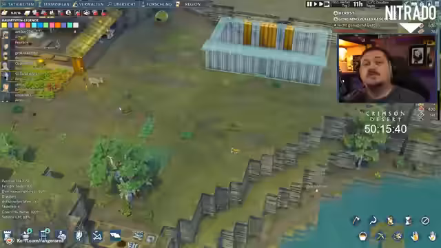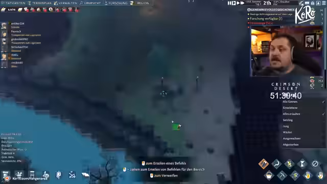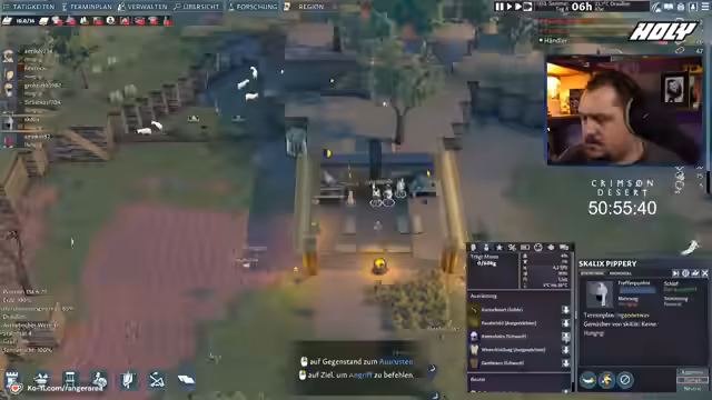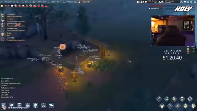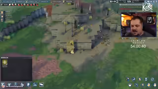 04:39:26Nachdem anfängliche Probleme bewältigt sind, konzentriert sich der Streamer auf die Weiterentwicklung der Siedlung. Er beginnt mit dem Bau einer Festungsanlage und die Verwaltung von Dorfbewohnern, deren Rollen wie Jäger, Schmied oder Geistlicher er neu zuweist. Während des Streams wird ein Giveaway für das Spiel Going Medieval angekündigt. Teilnehmer können durch das Hinterlassen eines Follers und Anwesenheit bei der Ziehung einen gewinnen. Auch künftige Spiele wie Entschrouded und Crimson Desert werden bereits als zukünftige Themen angekündigt.