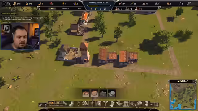 03:55:19Der Streamer wirbt für seinen Discord-Server und WhatsApp-Kanal, wo keine Videos und Livestreams verpasst werden können. Wer auf beiden Plattformen ist, bekommt einen 'guten Nudelstern'. Er beginnt mit dem Bau des Rathauses und bemerkt, dass die Kameraführung seltsam ist. Er stellt fest, dass Sklaven für den Bau benötigt werden und die Bauzeit sehr lang ist, besonders im Vergleich zu anderen Aufbauspielen.