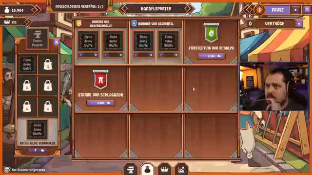 01:16:15Die Allianzen und Konflikte der Reiche bestimmen die Handelsstrategie. Nachdem er zunächst die 'geselligen Zwerge' beliefert, erkennt er eine neue Situation: ein Krieg zwischen Aschenthal und Schlagannor eskaliert. Obwohl Aschenthal ein Embargo gegen ihn verhängt, liefert er trotzdem weiter, da er sich nicht bevormunden lassen will. Die Situation wird dadurch kompliziert, dass er seine Verträge immer wieder anpassen muss, um auf die veränderte militärische Stärke der Reiche zu reagieren.