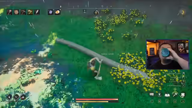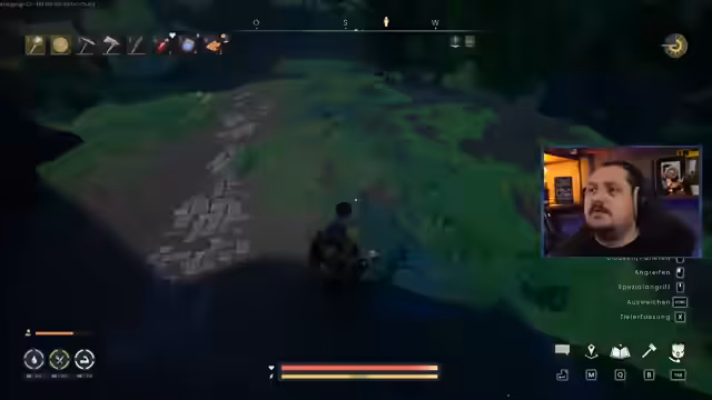 00:41:04Der Streamer durchläuft die anfänglichen Tutorial-Quests: Wasser holen, Ratten bekämpfen und Rattenbraten zubereiten. Dabei lernt er das Crafting-System kennen – vom Bau eines Handwerkstisches über die Herstellung einer Steinkeule bis zur Sammlung von Ressourcen wie Steinen und Holz. NPCs wie Doric (Schmied) und Zarnik (Überlebensexpertin) führen ihn in die Spielmechaniken ein und geben Kontext zur Spielwelt.