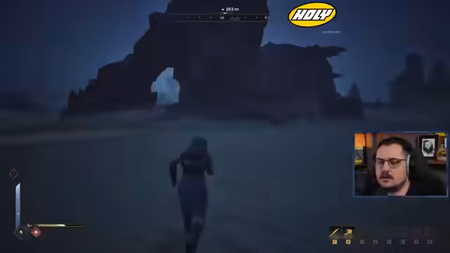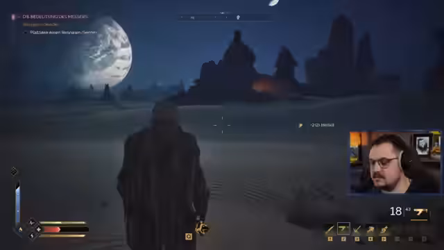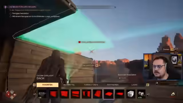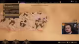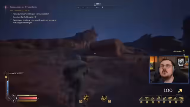 04:30:39Der Streamer erkundet weiter die Spielwelt, sammelt Ressourcen und interagiert mit der Umgebung. Dabei werden die ersten NPCs und Questanforderungen angesprochen. Eine konkrete Bedrohung durch einen Sandwurm wird angedeutet, der anhand von Indikatoren im Spiel erkennbar wird. Nachdem er ausreichend Material gesammelt hat, beginnt der Streamer mit dem Bau seiner ersten Basis. Er platziert einen Respawn-Sender und platziert seine Basis an einem entfernten Ort, um Konflikte mit anderen Spielern zu vermeiden.