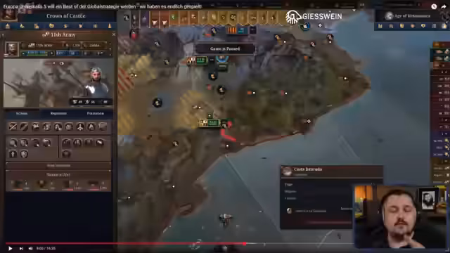 01:03:46Trotz der neuen Hilfsmittel gestaltet sich der Einstieg in das Spiel als schwierig. Obwohl der Streamer ein erfahrener EU4-Spieler ist, fällt es ihm schwer, in den ersten Stunden ein Gefühl für die neuen Spielkonzepte zu gewinnen. Paradox betont zwar, dass sich bis zum Release noch viel in der Spielerführung ändern wird, doch der schiere Umfang des Spiels lässt eine hohe Einstiegshürde erwarten. Auch die Ausprägung von Balancing-Problemen, Bugs und Exploits ist zu erwarten, zumal das Spiel von einem relativ kleinen Team von 35 Entwicklern erstellt wird. In den bisher gespielten Partien tauchen bereits verschiedene Probleme auf, von amüsanten Events, die nicht auf alle Eventualitäten vorbereitet sind, bis hin zu fehlerhaften Wegfindungs-Algorithmen der KI und endlosen Kriegen, in denen das KI-Kampfsystem noch seine Schwächen zeigt.