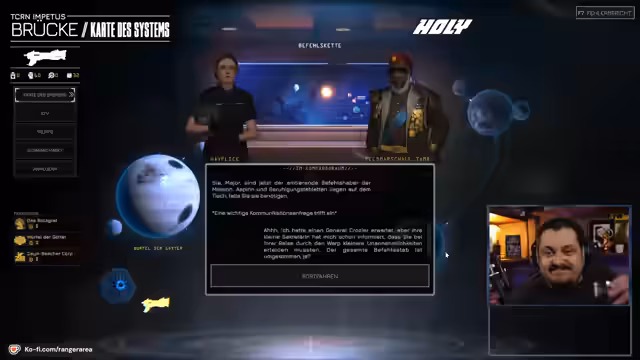00:37:28Nach technischen Vorbereitungen und der Einstellung der Herausforderung auf 'Experte' wird das Spiel gestartet. Der Streamer wählt zufällig seine anfänglichen Squad Leader aus, die jeweils eigene Trupps befehligen. Im Kommandoraum des Raumschiffs EFV wird die erste Mission eingeweiht: 'Das Rückgrat', bei dem es darum geht, eine Pirateninvasion auf einem Planeten zu stoppen. Die Mission startet auf einem zivilisierten Waldgelände und erfordert das Erobern bestimmter Punkte innerhalb von 10 Runden.