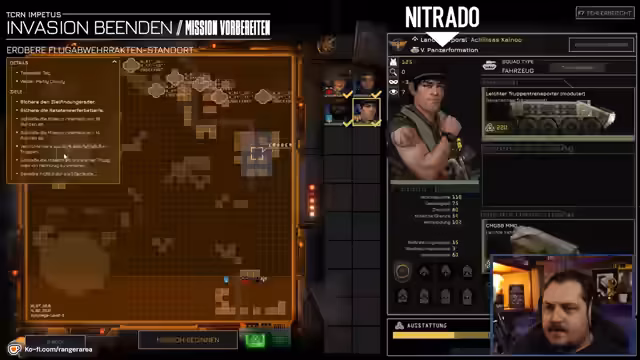 01:54:14Trotz anfänglicher Schwierigkeiten gelingt es dem Streamer, eine Mission abzuschließen, auch wenn es mehr Runden dauert als vorgesehen. Als Belohnung erhält er neue Ausrüstung und Gegenstände. Im Anschluss beschäftigt er sich mit dem Management seiner Trupps: Er befördert Charaktere und verleiht ihnen neue Fertigkeiten. Dabei kritisiert er negative Eigenschaften wie Verletzungen und den daraus resultierenden Snowball-Effekt, der Einheiten kampfunfähig machen kann.