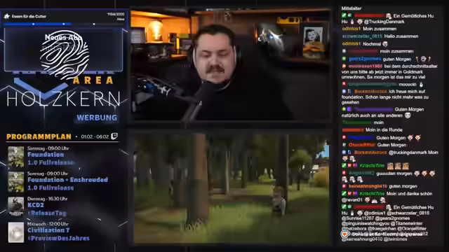 03:09:20Der Streamer preist die grafische Aufwertung des Spiels nach dem 1.0 Update, die er mit Manorlords vergleicht. Die neuen Blumenwiesen und die geordnete Anordnung der Gebäude werden besonders hervorgehoben. Es werden persönliche Zukunftspläne geteilt, darunter Foundation bis 14 Uhr, gefolgt von einem Entschrouded-Update-Stream mit Yvraldes. Der Stream kündigt an, Giveaways für verschiedene Spiele wie Entschrouded, Foundation und Kingdom Come Deliverance 2 zu veranstalten, wobei Keys gewonnen werden können.