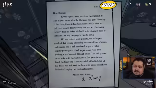 01:02:25Der Stream beginnt mit der Erkundung des Anwesens, wobei der Fokus auf das Finden von fünf Münzen und die Lösung des ersten Rätsels im Parlor Room gerichtet ist. Der Streamer analysiert die Boxenrätsel, bei dem eine Box immer die Wahrheit sagt, eine immer lügt und nur eine einen Edelstein enthält. Durch logische Schlussfolgerungen identifiziert er die wahre Box und sammelt den Edelstein. Gleichzeitig entdeckt er das Layout des Hauses, wie z.B. dass der Korridor immer unverschlossen ist und die Türverteilung im West Wing öfter verschlossen ist.
