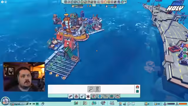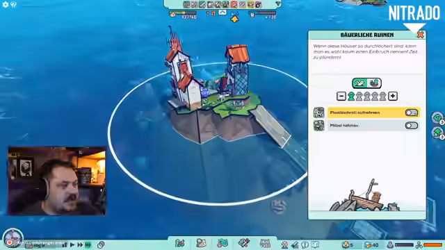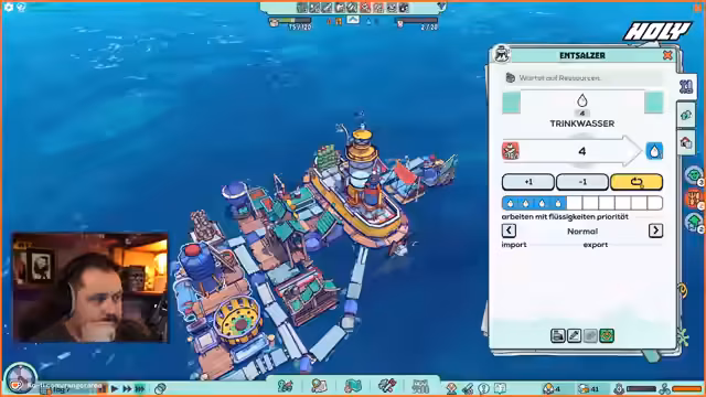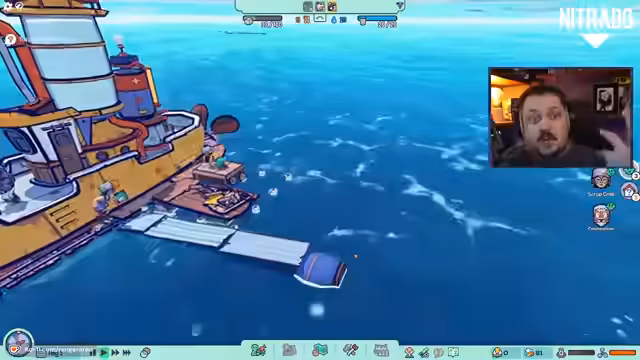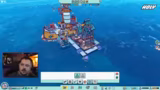 03:12:58Nach dem warm-up wird mit dem eigentlichen Gameplay im Spiel Flotsam begonnen, welches als Mischung aus Raft und Rimworld beschrieben wird. Der Streamer erkundet die Spielwelt, sammelt Ressourcen wie Plastik und Holz und stellt erste Gebäude her, um eine kleine Gemeinschaft auf einem schwimmenden Schiff zu etablieren.
