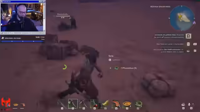 00:37:25Die Basis entwickelt sich weiter, mit Erweiterungen wie einer Werkbank, Lagermöglichkeiten und einer Kochstelle. ranzratte nimmt erste Quests an, wie das Finden von Schatztruhen und das Sammeln bestimmter Materialien. Er erkundet die Umgebung und stößt auf neue Herausforderungen wie wilde Tiere und das Erkennen von Rohstoffquellen wie Kupfererz und Ton. Er äußert Begeisterung für den Langzeitspaß des Spiels und die Möglichkeit, später größere Schiffe zu bauen und weiter zu erkunden.