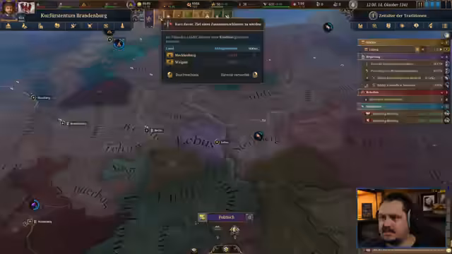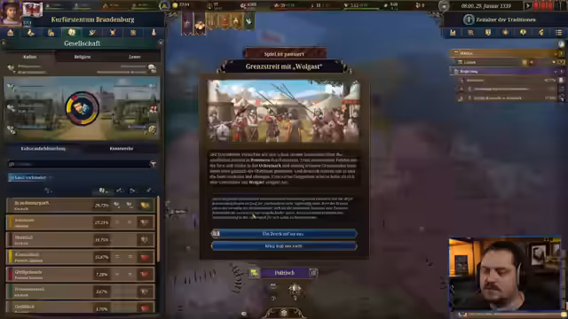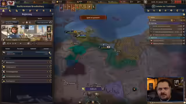 01:24:25Nach einem Monat Spielzeit erklärt Herzogtum Braunschweig Brandenburg zum Rivalen. Die Wirtschaftsanalyse zeigt, dass genügend Nahrung produziert wird. Ein wichtiges Ereignis ist der Übergang Brandenburgs an das Haus Wittelsbach, was zu Legitimitätsverlusten und dem Modifikator 'Wittelsbacher Vernachlässigung' führt, der Kontrolle und Legitimität negativ beeinflusst. Dieses Ereignis ist aktiv, bis Brandenburg nicht mehr von den Wittelsbachern regiert wird oder ein spezielles Ereignis eintritt. Die ineffiziente Münzprägung wird thematisiert, da sie durch mangelnde Waren die Geldeinnahmen reduziert und Inflation verursacht. Das Spiel beginnt im Jahr 1337, dem Start des Hundertjährigen Krieges, bei dem sich der Spieler entscheiden kann, ob er sich England oder Frankreich anschließt oder neutral bleibt. Brandenburg entscheidet sich aufgrund seiner geringen Bedeutung und der Unkenntnis der Kriegsmechaniken für Neutralität. Ein Abgesandter aus Oberbayern verkündet, dass Brandenburg fortan von Stefan von Wittelsbach regiert wird, was zu einer Personalunion mit Lausitz führt und die Anzahl der Beziehungen erhöht, was wiederum die Kronmacht reduziert.