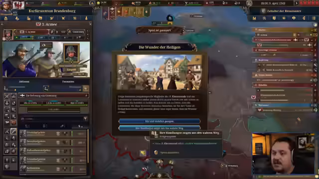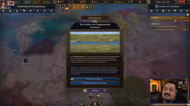 01:45:07Der Streamer erklärt, dass die anfänglichen, häufigen Ereignisse in Brandenburg spezifisch für diese Region sind und den historischen Übergang der Herrschaft von den Wittelsbachern zu den Hohenzollern abbilden. Diese Ereignisse ziehen sich über etwa 100 Jahre hinweg und sind notwendig, um die spätere Gründung Preußens zu ermöglichen. Er erwähnt, dass man theoretisch die Geschichte ändern könnte, indem man sich von Anfang an für die Wittelsbacher entscheidet, aber sein Ziel ist es, die Hohenzollern an die Macht zu bringen. Ein aktuelles Ereignis beschreibt die Skepsis der brandenburgischen Einheimischen gegenüber dem neuen Kurfürsten Stefan von Wittelsbach, der als Fremder mit ungewohnten Bräuchen wahrgenommen wird. Dies unterstreicht die narrative Tiefe und die historische Einbettung des Spiels.
