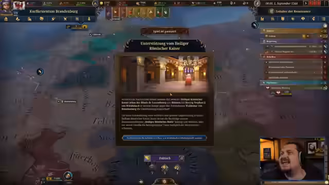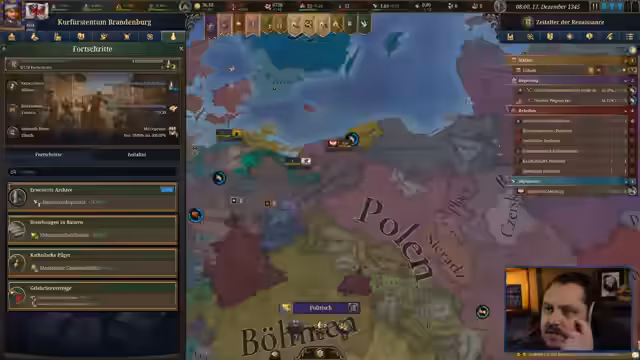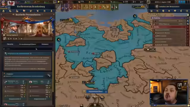 03:08:21Das Zeitalter der Renaissance bricht an, was neue Möglichkeiten für Fortschritt in Verwaltung, Diplomatie und Militär eröffnet. Der Streamer entscheidet sich für einen Schwerpunkt auf Verwaltung, um Brandenburg zu managen. Er bedauert das Fehlen von Missionsbäumen, die das Spiel einfacher gemacht hätten. Eine Personalunion mit Oberbayern und Brandenburg wird gebildet, was gegenseitigen Schutz und gemeinsame Gesetzgebung ermöglicht. Der Streamer ist verwirrt über die Rolle als Juniorpartner in dieser Union. Brandenburg plant weitere territoriale Expansionen, wobei die Einverleibung von Provinzen wie Halberstadt und Bernburg lange dauern würde. Die finanzielle Unterstützung des Adels wird beschlossen, um deren niedrige Zufriedenheit zu verbessern. Der Streamer entdeckt, dass ein Gebäude in der falschen Provinz gebaut wurde und die Renaissance-Institution in Milano erschienen ist.