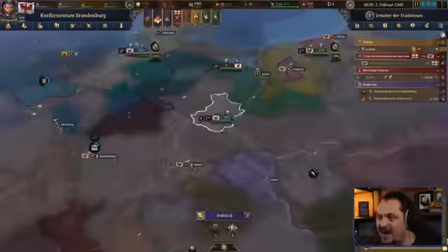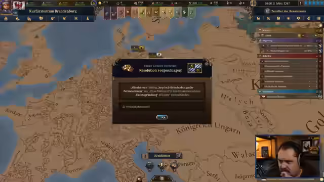 01:34:19Als Reaktion auf die Krise wird eine Personalunion mit Oberbayern gebildet. Dies löst die akute Krise ab, führt aber zu neuen Problemen: Die Beziehungen zu anderen Staaten sind nun zu dicht, was die Kronenmacht reduziert. Der Streamer navigiert durch die diplomatischen Konsequenzen und versucht, die Beziehungen zu optimieren, während das Spiel im Jahr 1337 dem Beginn des hundertjährigen Krieges gedenkt, zu dem Brandenburg jedoch keine Stellung bezieht.