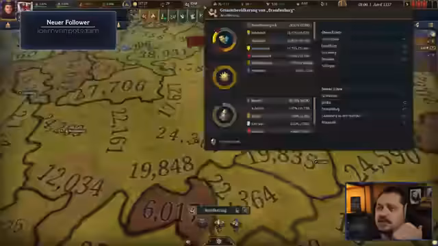 04:09:58Der Schwarze Tod erreicht das Land, und der Streamer muss Entscheidungen treffen, um die Auswirkungen zu mildern, wie die Finanzierung von Massenvergebungen oder das Suchen von Sündenböcken. Er entscheidet sich für die Kontrolle der Nahrungsmittel und nimmt Prestigeverlust in Kauf, um die Kosten für den Nahrungsankauf zu senken. Eine Debatte über Zentralisierung oder Föderalismus in der bayerisch-brandenburgischen Personalunion wird geführt, wobei Bayern den Seniorpartner-Status anstrebt. Die Beulenpest wütet weiter und fordert viele Menschenleben, während der Streamer versucht, die Stabilität zu erhöhen und die Adeligen zu besänftigen, die aufgrund fehlender Ressourcen unzufrieden sind. Er versucht, die Besteuerung des Adels zu senken, um die Stabilität zu verbessern, was jedoch nicht ausreicht. Eine weitere politische Krise tritt auf, und das Spiel stürzt ab, was die Frustration des Streamers verdeutlicht.
