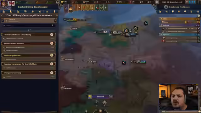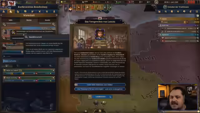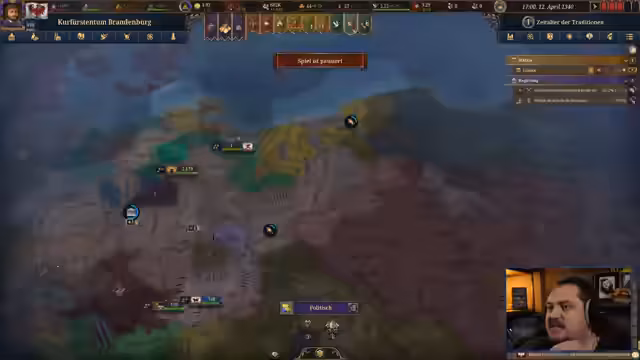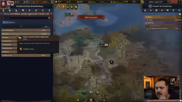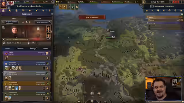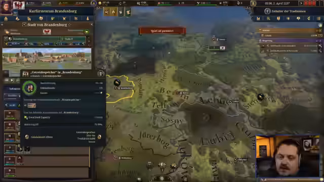 01:04:39Das Festlegen von Rivalen ist wichtig, da dies sonst zu Malus führt. Rivalen können nur in einem bestimmten Umkreis markiert werden; Stettin wird als erster Rivale gewählt, da es ein wichtiger Punkt für Brandenburg ist, das keinen direkten Zugang zum Wasser hat. Die obere Leiste zeigt Aufgaben nach Dringlichkeit an (gelb: dringlich, rot: sehr dringlich, grün: kann laufen, blau: Information). Pop-Bedarfe und Märkte werden erläutert; Brandenburg bezieht Waren aus Lübeck, Prag und Krakau und hat Defizite bei Getreide, Pelzen und Obst. Man kann dem entgegenwirken, indem man Handel betreibt oder Ressourcengewinnungsgebäude (RG) baut, was an Victoria 3 erinnert. Die Provinzkontrolle ist entscheidend für Steuern, Militär und Aufgebote und wird durch Berater erhöht. Brandenburg hat aufgrund seiner sumpfigen und steinigen Gebiete eine schlechte Kontrolle, was durch die Einstellung von Kabinettsmitgliedern verbessert werden kann.