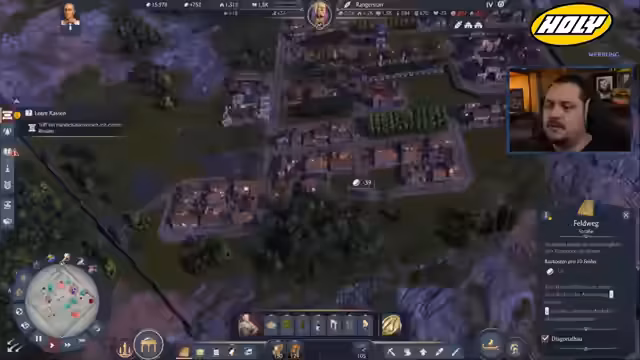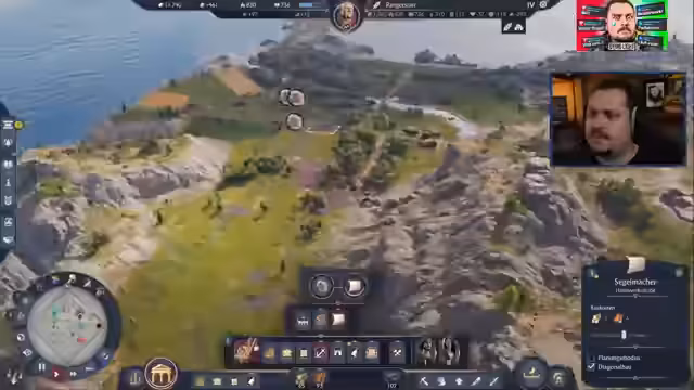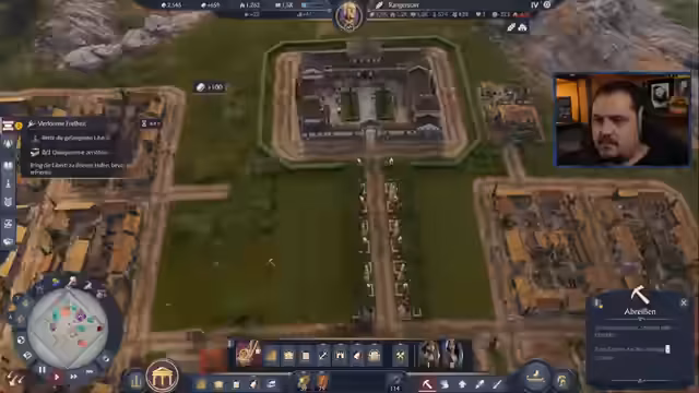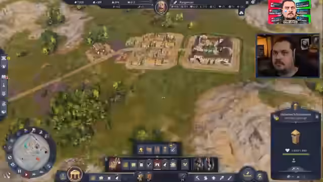 01:46:49Die Siedlung expandiert durch das Erkunden neuer Landstriche. Dabei stellt der Streamer fest, dass das Wirtschaftssystem in Anno 117 deutlich anspruchsvoller ist und der Gewinn von Geld weitaus schwieriger als in Vorgängertiteln. Trotz Wachstum und der Errichtung weiterer Gebäude wie Kasernen an strategisch günstigen Orten bleibt das Geld knapp, was die strategische Planung komplexer gestaltet.