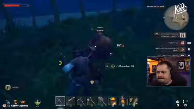 02:02:24Der Streamer beginnt mit dem Sammeln von grundlegenden Ressourcen wie Holz und stellt fest, dass dies für den Bau von Strukturen ausreicht. Ein kurzer Exkurs über den Comicladen in der Innenstadt und den Games Workshop folgt, der geschlossen ist. Das Gameplay wird als sehr flüssig und spaßig beschrieben, insbesondere die erste Stunde, die typisches Open-World-Survival ist. Der Spieler stellt seine Nahkampfwaffe her und entdeckt die Schnellreiseglocke, welche für das Reisen im Spiel essentiell ist.