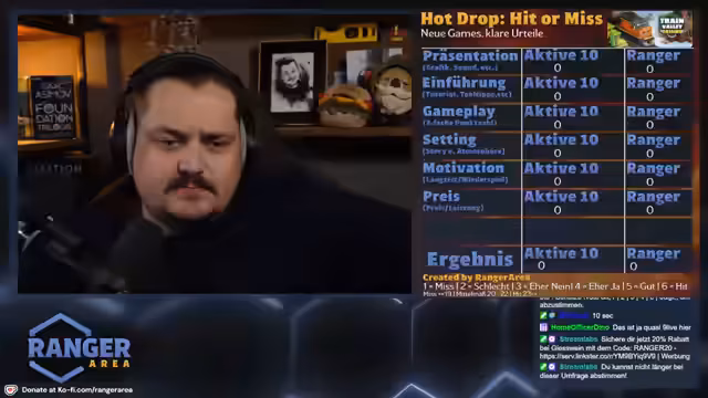 02:05:41Nach dem Gameplay-Abschnitt beginnt die offizielle Wertung des Spiels 'Train Valley Origins'. Ein von der Community-Mitglied Elaniana moderiertes Bewertungssystem mit sechs Kategorien wird eingeführt. Die Kategorien sind Präsentation, Einführung, Gameplay (zweifach gewertet), Setting, Motivation und Preis-Leistung. Für jede Kategorie können Zuschauer im Chat von 1 (schlechtest) bis 6 (beste) abstimmen. Der Streamer legt mit seinen eigenen Punkten los und beginnt mit der Kategorie Präsentation.