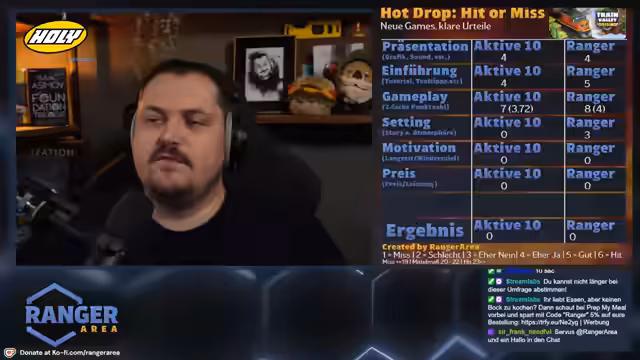 04:30:57Nach dem Abschluss des Spiels startet der Streamer den Bewertungsteil des Streams. Er präsentiert die Kategorien, für die die Zuschauer abstimmen können: Präsentation, Einführung, Gameplay, Setting, Motivation, Langzeitwert, Preis-Leistung und Gesamtwertung. Die Zuschauer werden aufgefordert, ihre Bewertung von 1 (sehr schlecht) bis 6 (hervorragend) für die einzelnen Kategorien mit einem Kommando im Chat abzugeben. Er beginnt mit der Abstimmung zur Kategorie Präsentation.